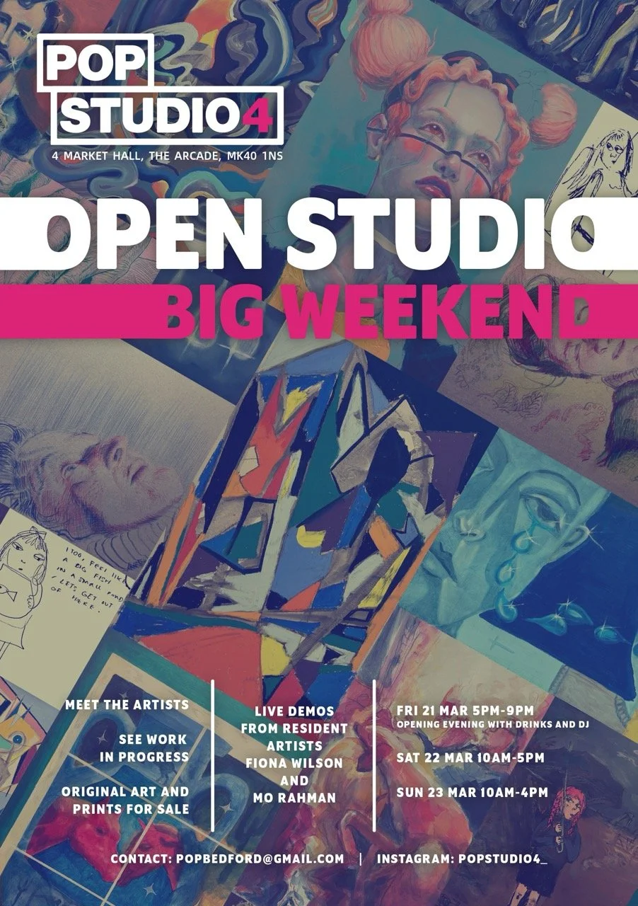 Mo Rahman, Talia Giles, Fiona Wilson, Emily Baxter and Giacomo Verdura invite you into their town centre studio to get up-close and personal with their work in progress and studio practices. Opening with a ‘Friday Late’ on the Friday, this new Open Studio Big Weekend format will give you a glimpse into the life of a Bedford artist, and is the first of 4 set to take place at POP STUDIO4 in The Arcade this year.